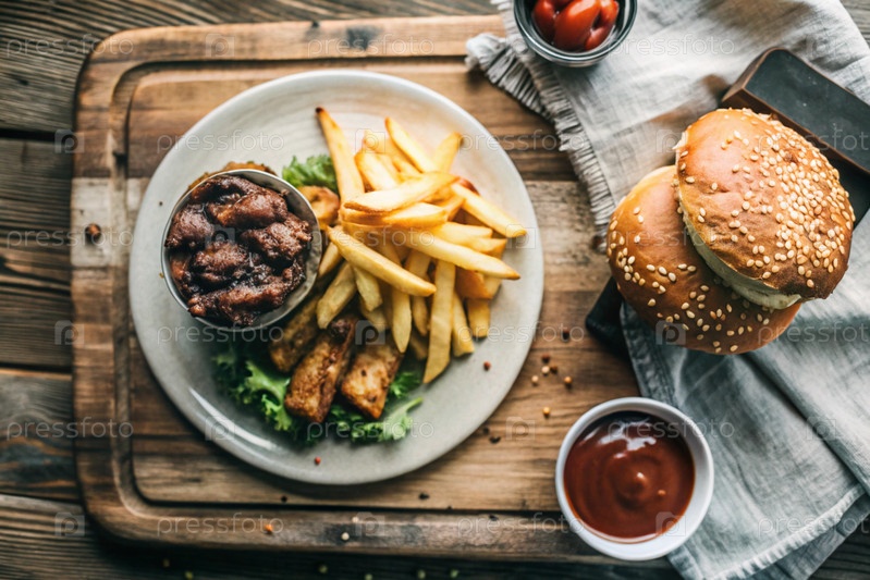Фри, гамбургеры, свиные ребра на стильной доске на деревянном фоне. жареный картофель. концепция фаст-фуда, нездоровой еды и приготовления быстрого питания