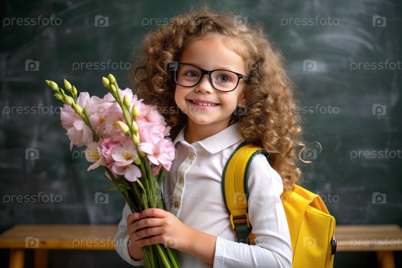Милая, красивая первоклассница с очками. Букет цветов. Ребенок впервые идет в школу. Ребёнок с рюкзаком, книгой и цветами. Возвращение к школе