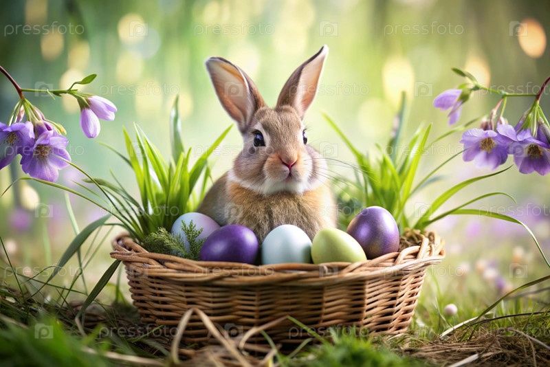Баннер. пасхальный кролик в корзине из красочных пасхальных яиц вокруг весенних снегопадов и первичной розы. концепция праздника Пасхи