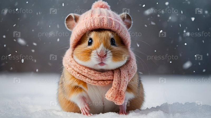 Забавный хомяк с большими щеками, одетый в уютную мягкую розовую тёплую одежду, шляпу и шарф на зимнюю тематику