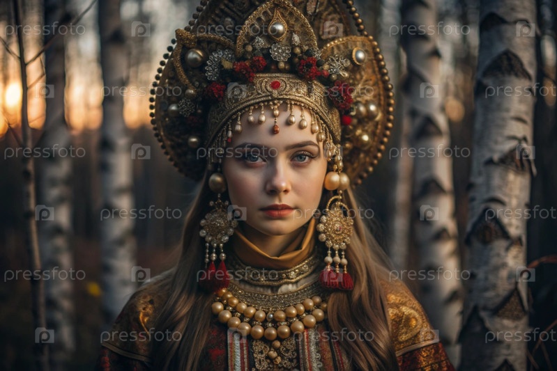 Красивая девушка в традиционном русском национальном костюме.Перед березовым ростом.Портрет символизирует традиции и красоту русского народа