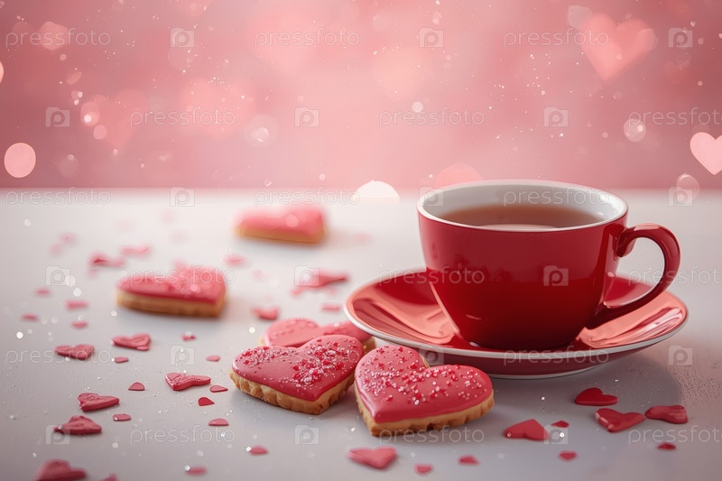 Домашнее имбирное печенье в форме сердца и чашка чая на столе. вкусный имбирный кекс в форме сердца на светло-розовом фоне. свежевыпеченный имбирный кекс на День святого Валентина