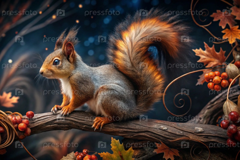 Портрет красивой красной пушистой белки на ветке осеннего дерева с красными ягодами