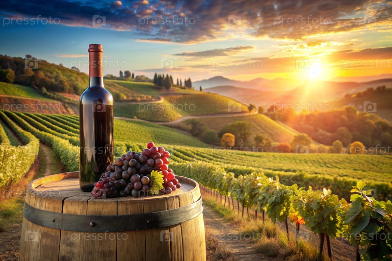 Бутылка красного вина и куча спелых виноград на деревянной дубовой бочке на фоне виноградника