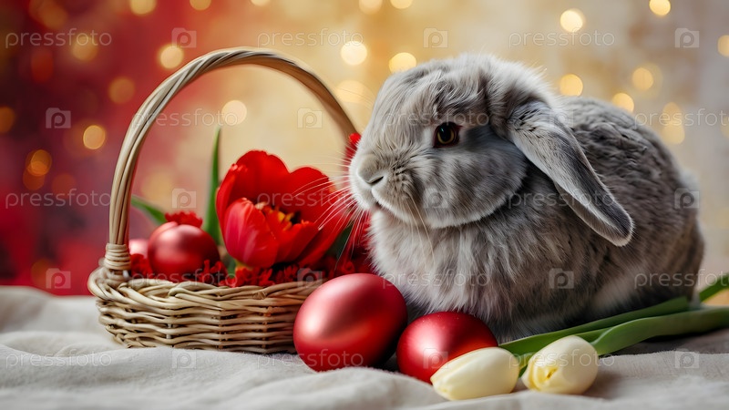 Концепция ярких пасхальных праздников - яркие пасхальные яйца в корзине из колючки, кролик и красные цветы на пастельном фоне воды