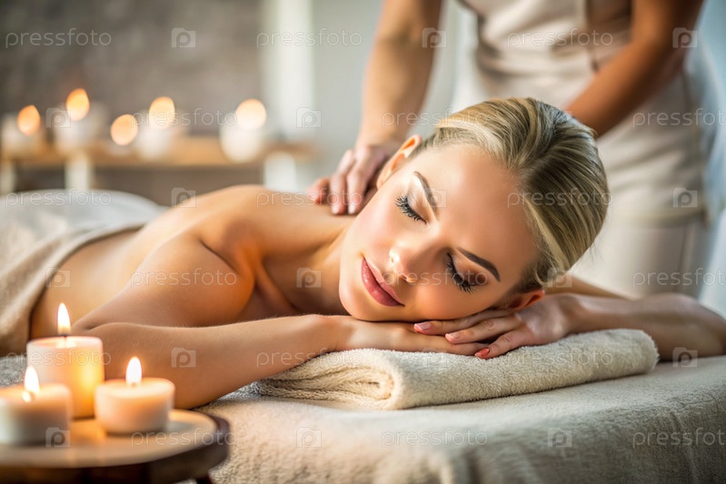 Баннер для профессиональных массажных салонов.Молодая, красивая блондинка наслаждается массажем в современном спа при свечах.Освобождение и гармония, уход за телом