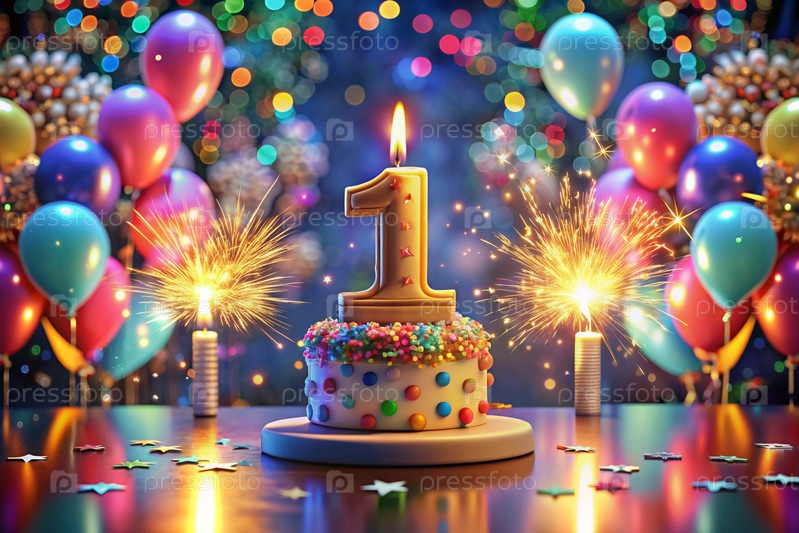 Торт для детской вечеринки. На торте номер 1. На заднем плане есть воздушные шары и красивая фотозона. Концепция - это день рождения детей