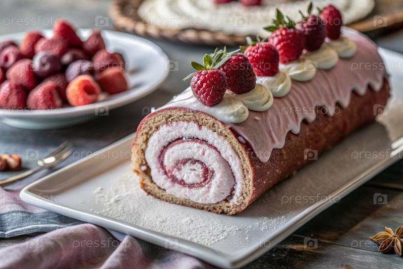 Швейцарская губка с малиной, вкусный фруктовый и сливочный десерт наполненный кремовым сыром, украшенный свежими малинами