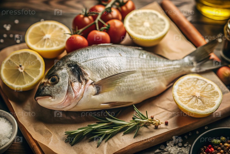 Вкусная и здоровая рыба. сырой дорадо с лимоном и ингредиентами на темном фоне. баннер, меню, место для текста рецепта, верхний вид