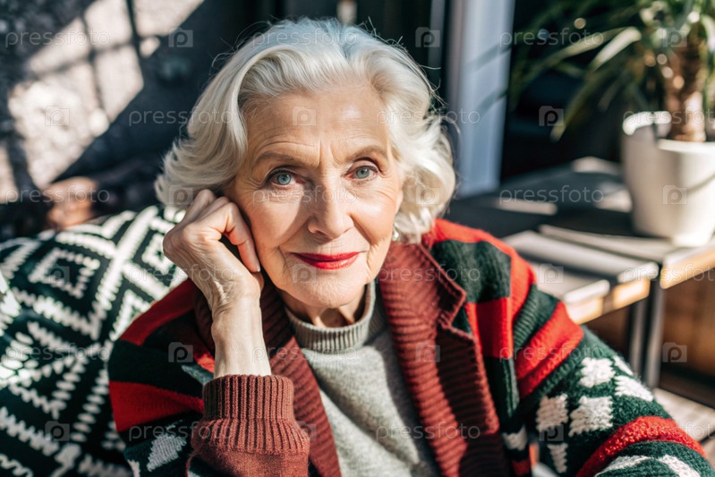 Минимализм.Студийный портрет стильной, элегантной пожилой женщины, 70-летнего пенсионера в интерьере и одежде спокойных тонов.Концепция пожилых людей