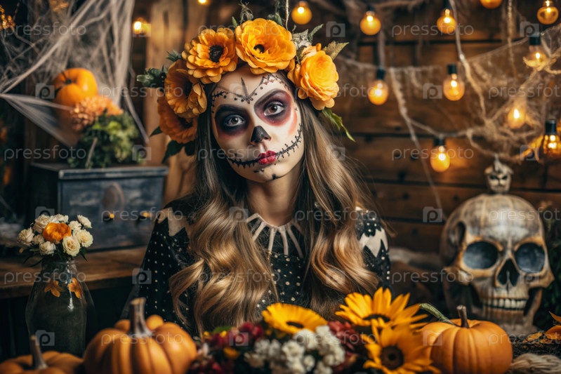 Концепция Хэллоуина. Ужасно. Костюмированная вечеринка. Красивая женщина с покрашенным черепом на лице и цветами на голове. Баннер, открытка