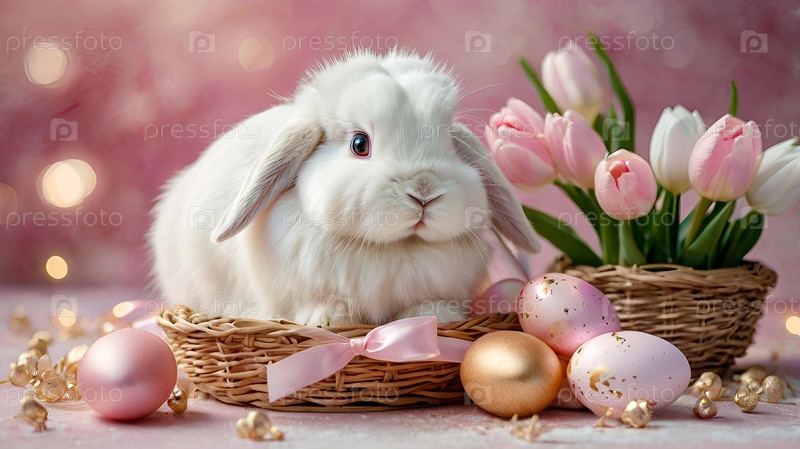 Нежные пасхальные яйца, белый кролик и нежные цветы тюльпанов на пастельном акварельном фоне с нежными венами