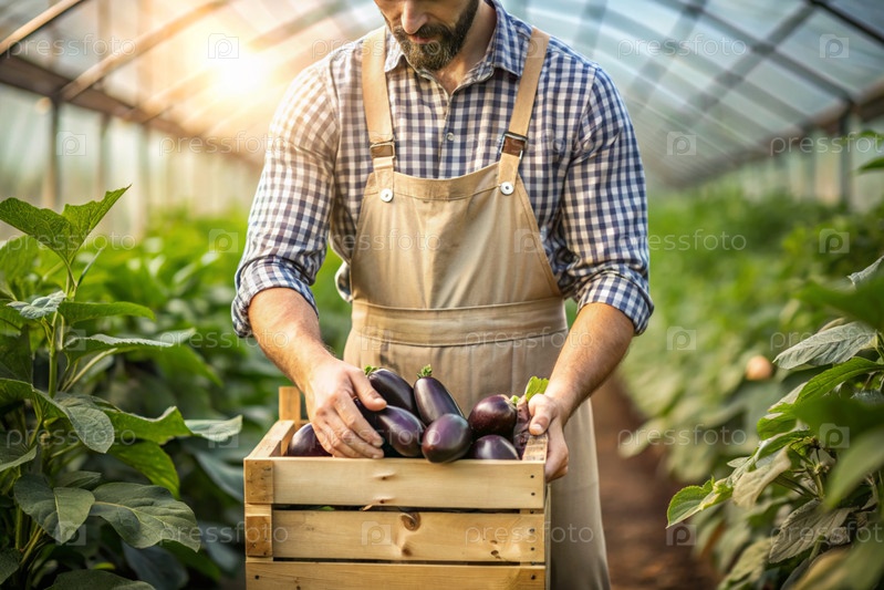 Сельскохозяйственная промышленность. деревянный ящик с баклажанами в руках фермера. садовник собирает богатый урожай в теплице
