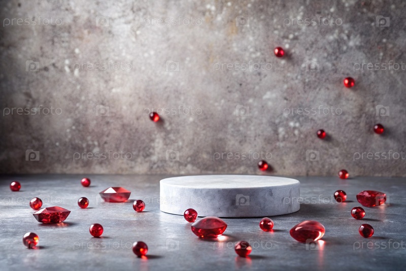 Минималистский фон для выставки ювелирных изделий. Современный пустой подиум с серой стеной и рубинами. Креативный дизайн презентации продукта