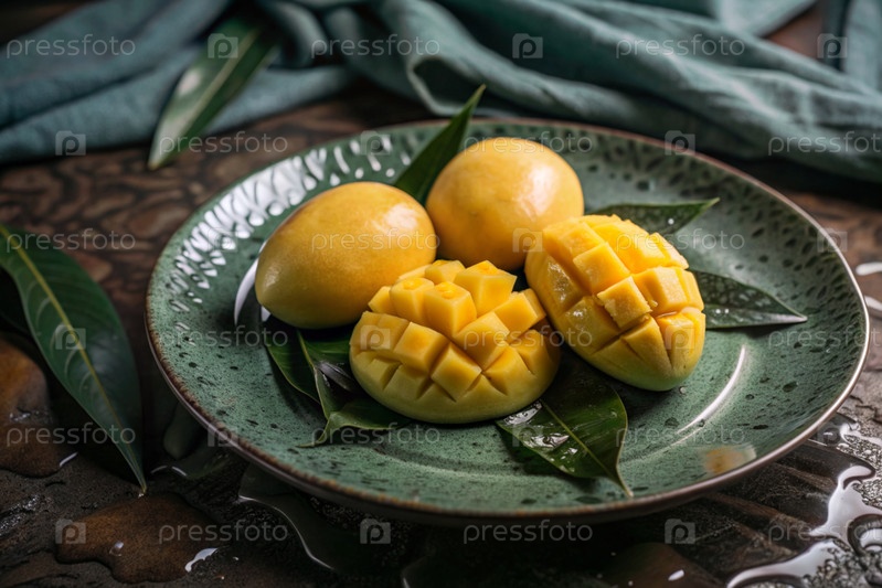 Свежие манго. Вкусные ягоды и фрукты ярко-желтого цвета с капельками воды. Вегетарианство. Здоровое питание. Свежий плод на столе