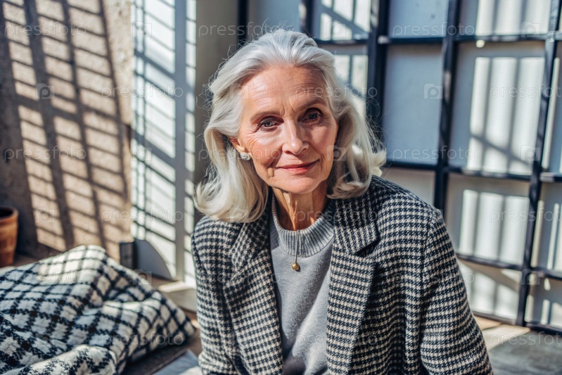 Минимализм.Студийный портрет стильной, элегантной пожилой женщины, 70-летнего пенсионера в интерьере и одежде спокойных тонов.Концепция пожилых людей