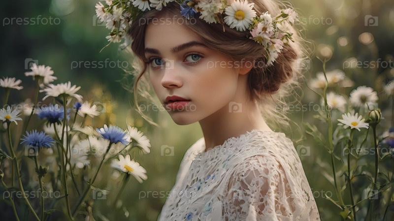 Красивая девушка с венком ромашки и кукурузных цветов на голове в поле. День святого Петра и Февронии. Всероссийский день семьи, любви, верности