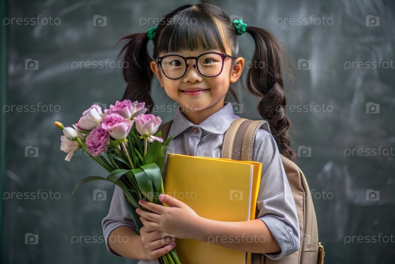 Первоклассный азиат с очками на доске. Девушка держит цветы в руках. Ребенок пойдет в школу впервые. Ребёнок с рюкзаком, книгой и цветами. Возвращение к школе