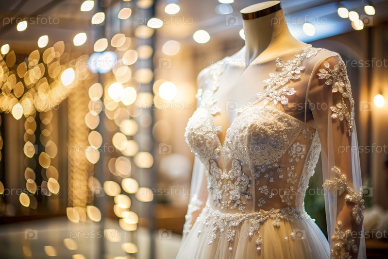 Аренда и покупка свадебных платьев для мероприятий. Близкие. Элегантное белое свадебное платье на манеке в роскошном брачном салоне