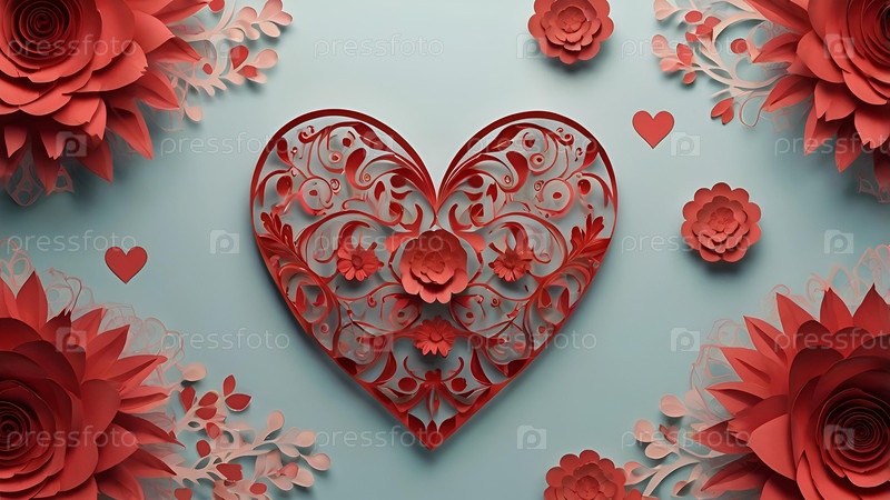 Концепция Дня святого Валентина с красным сердцем, изображающим Любовь. Стильный дизайн бумажных цветов. Копировальное пространство