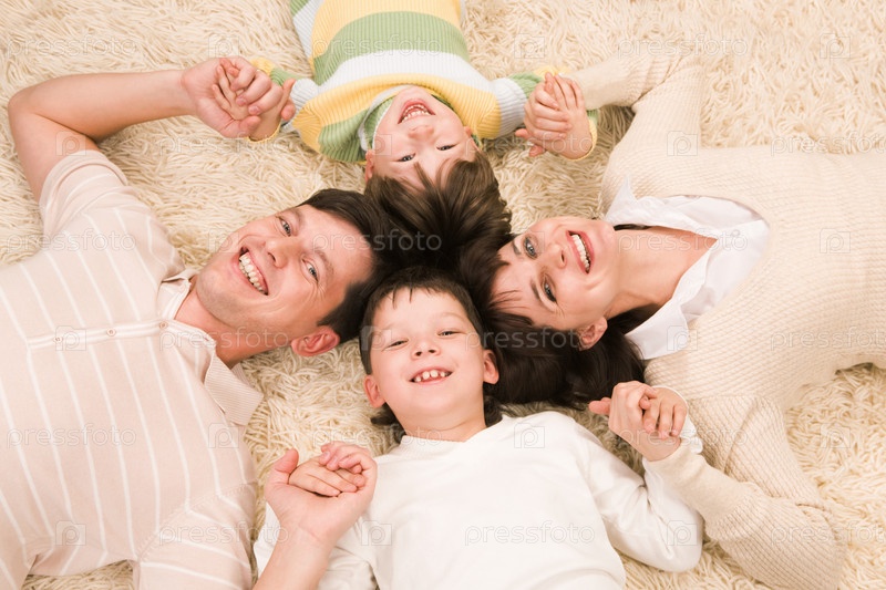 Вид сверху веселых родителей со своими двумя детьми, улыбающихся перед камерой