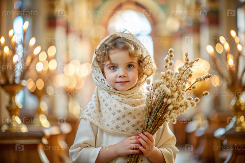 Пальмовое воскресенье. христианство. портрет трехлетней девочки в русском народном шале с ветвями ивы в руках на фоне православной церкви
