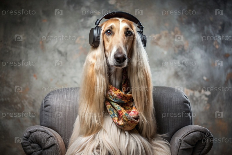 Музыкальный любитель.Афганская собака слушает музыку в больших беспроводных наушниках дома, на стуле в гостиной.Гармония, расслабление и омоложение