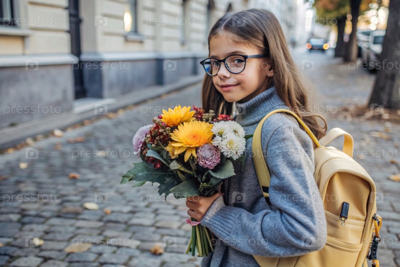 Красивая девушка с очками и букетом осенних цветов впервые идет в школу. Ребенок со школьной сумкой, книгой и цветами. Малыш на городской улице