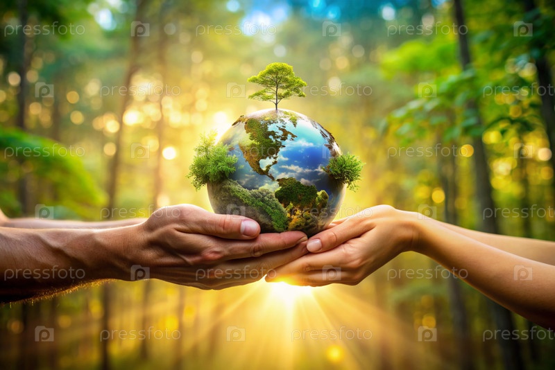 Мужчины и женщины держат маленькую модель Земли. Возрождение. Забота о планете, экологическое сознание и единство людей в сохранении природы