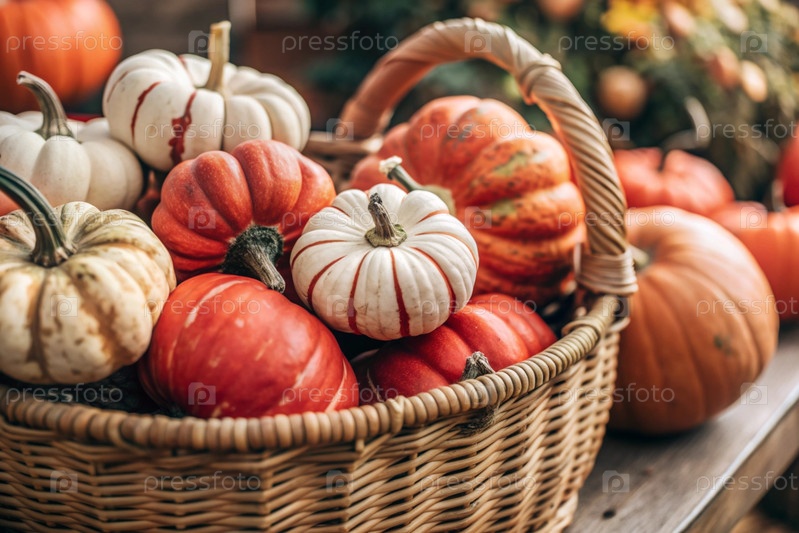 Осенний фон красочные декоративные тыквы в плетеновой корзине богатый урожай концепция Хэллоуина