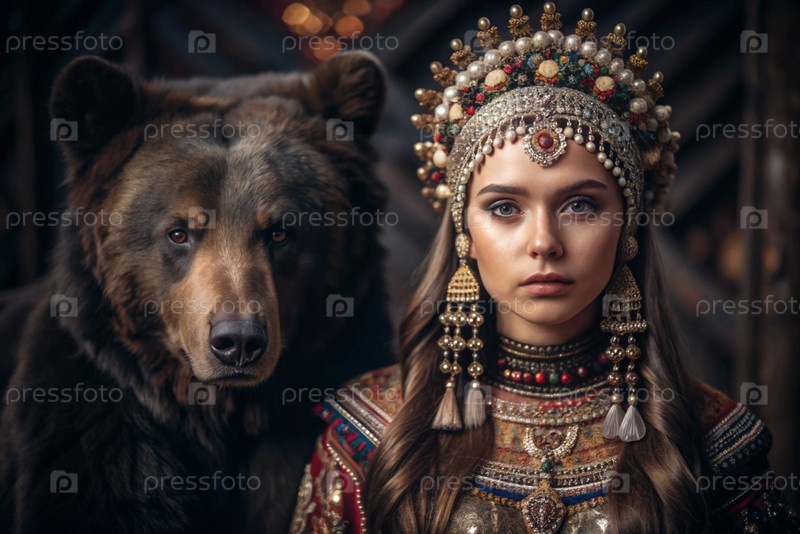 Красивая девушка в традиционном русском национальном костюме.Перед живым медведем.Портрет символизирует традиции и красоту русского народа