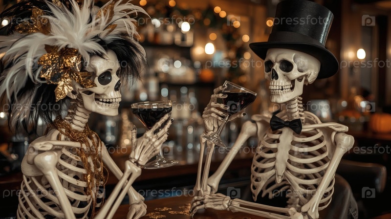 Пара любителей скелетов с коктейлями в баре.Хэллоуин или День мертвых
