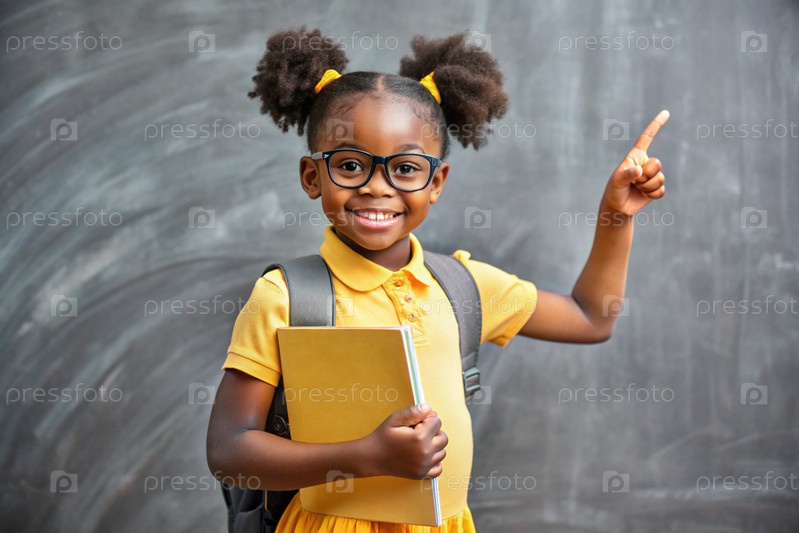 Милая чернокожая афроамериканка с очками показывает класс рукой. Ребенок впервые идет в школу. Ребёнок со школьной сумкой и книгой. Ребёнок в классе с доской. Возвращение к школе