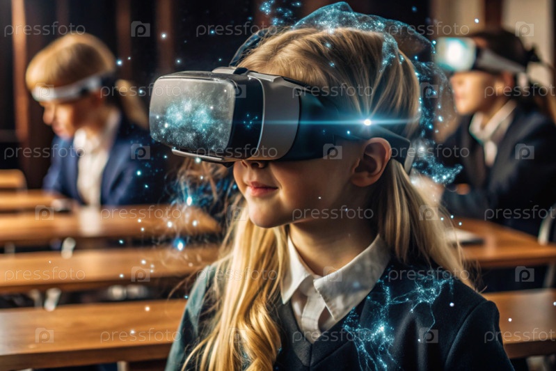 Девочка с очками виртуальной реальности. Ребенок находится в классе, а другие ученики на заднем плане. Цифровой интерфейс отображается в наушниках