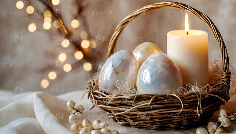 Нежные пасхальные яйца в жемчужной корзине и нежные цветы на пастельно-водном фоне