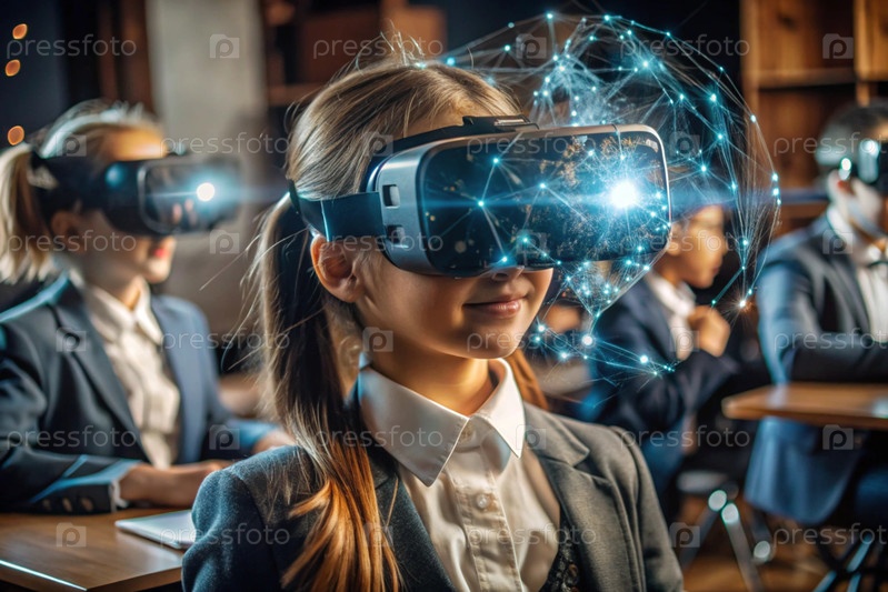 Девочка с очками виртуальной реальности. Ребенок находится в классе, а другие ученики на заднем плане. Цифровой интерфейс отображается в наушниках