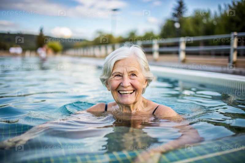 Пожилая женщина плавает и занимается водной аэробикой в отопительном бассейне, счастливый и улыбающийся пенсионер