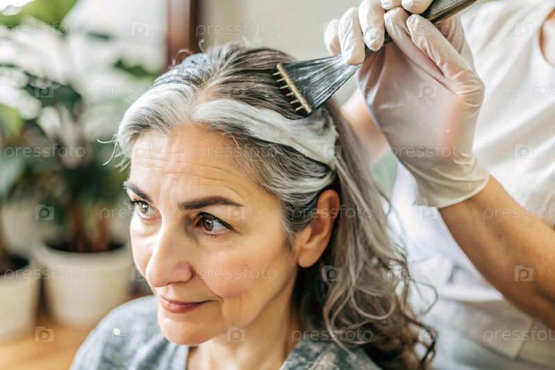 Женщина средних лет красит дома седые волосы.Женщина сидит во внутренней части комнаты.Дочь рисует маму