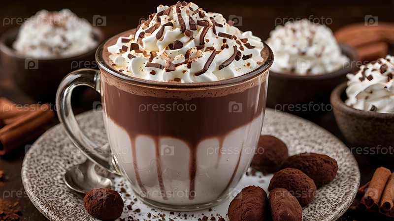 кружка горячего какао или кофе со сливкой и шоколадом. уютная фотография в мягких, теплых коричневых тонах. концепция вкуса, гармонии и комфорта
