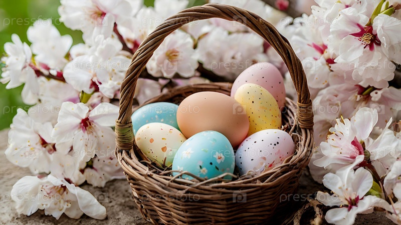 Красивый фон с пасхальными яйцами в плетеновой корзине и весенними вишневыми цветами