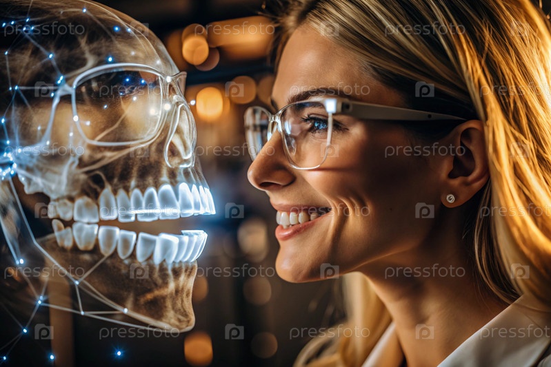 Новые технологии цифрового искусственного интеллекта в зубных протезах. Имплантаты. Женщина-стоматолог с идеальной улыбкой и цифровой графикой на виртуальном экране