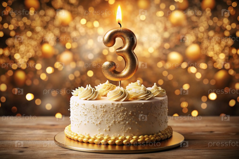 Торт для детской вечеринки. На торте номер 3. На заднем плане есть воздушные шары и красивая фотозона. Концепция - это день рождения детей