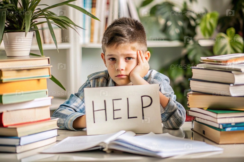 Учебный год.Ребенок сидит за столом с кучей учебников, книг и знака помощи.Образование, помощь