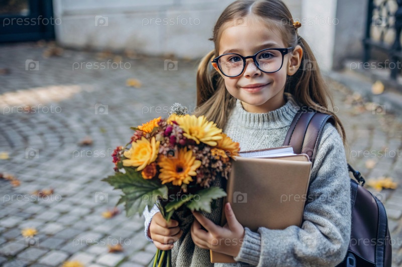 Красивая девушка с очками и букетом осенних цветов впервые идет в школу. Ребенок со школьной сумкой, книгой и цветами. Малыш на городской улице