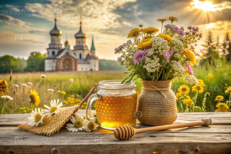 Концепция российского православного праздника 'Мёд Спаситель'.Стеклянная кружка с медом, сосны и букет диких цветов на фоне Православной церкви