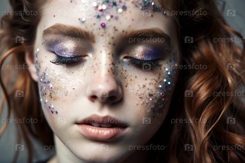 Покрытие лица девушки праздничным макияжем и ленточками.Изображение придает ей сказочный и мистический вид.Концепция новогодней ночи или дня рождения