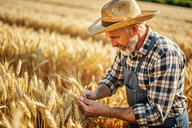 Фермер-мужчина держит золотые колосья пшеницы на фоне созревающего поля. Близкий план фермера. Концепция посадки и сбора богатого урожая. Сельский пейзаж при закате солнца