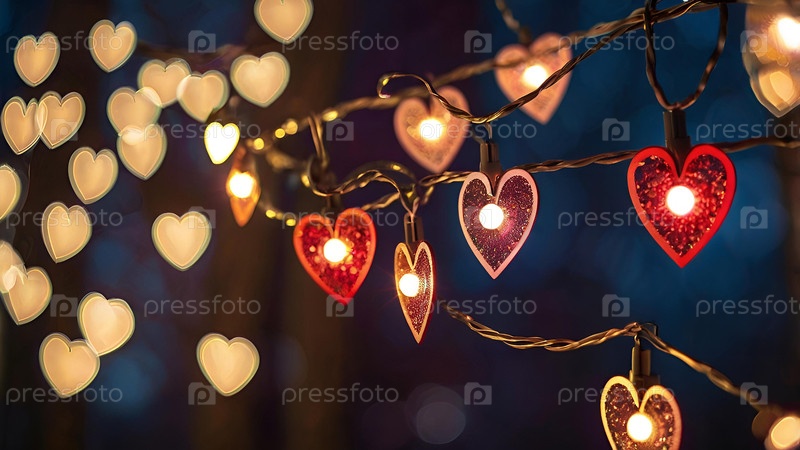 Концепция Дня святого Валентина, баннер с гирляндами в форме сердец и волшебными огнями для праздника, наполненного любовью