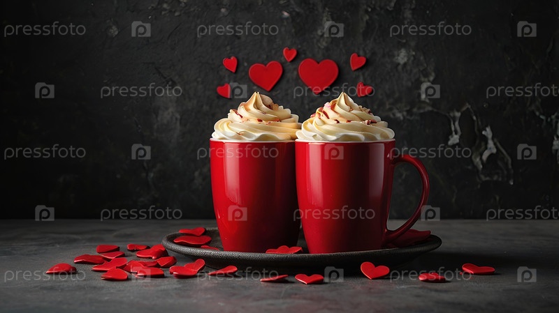 Концепция Дня святого Валентина для кафе и ресторанов красные чашки кофе латте с сердцами вокруг горячие напитки для влюбленных
