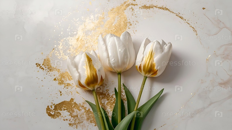 Тюльпаны - это весенние цветы. Красивый цветочный фон с красивым эффектом боке. Пузырьки тюльпана на белом акварельном фоне со золотыми венами